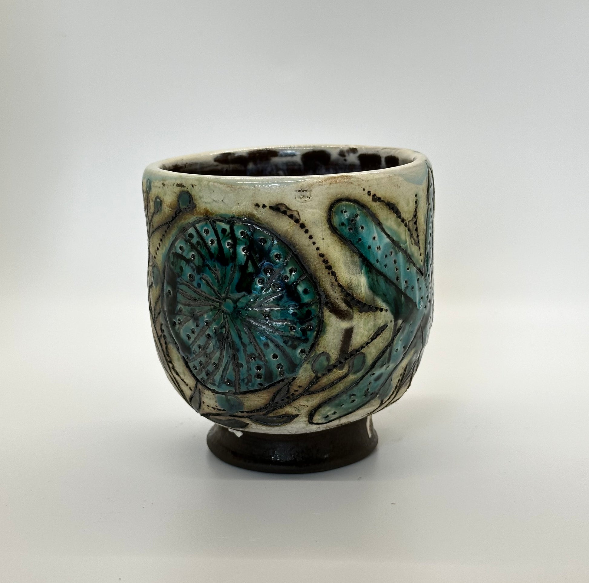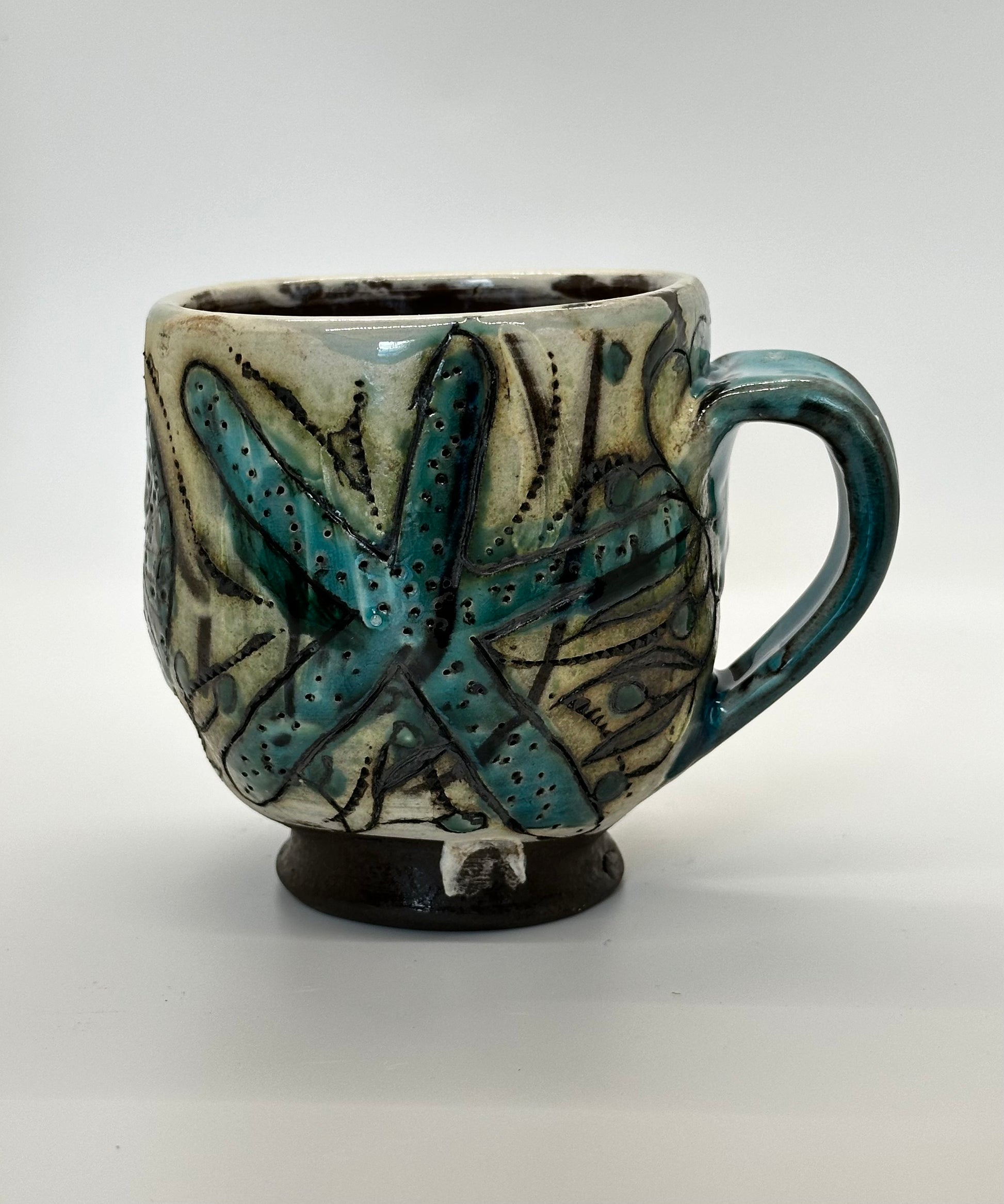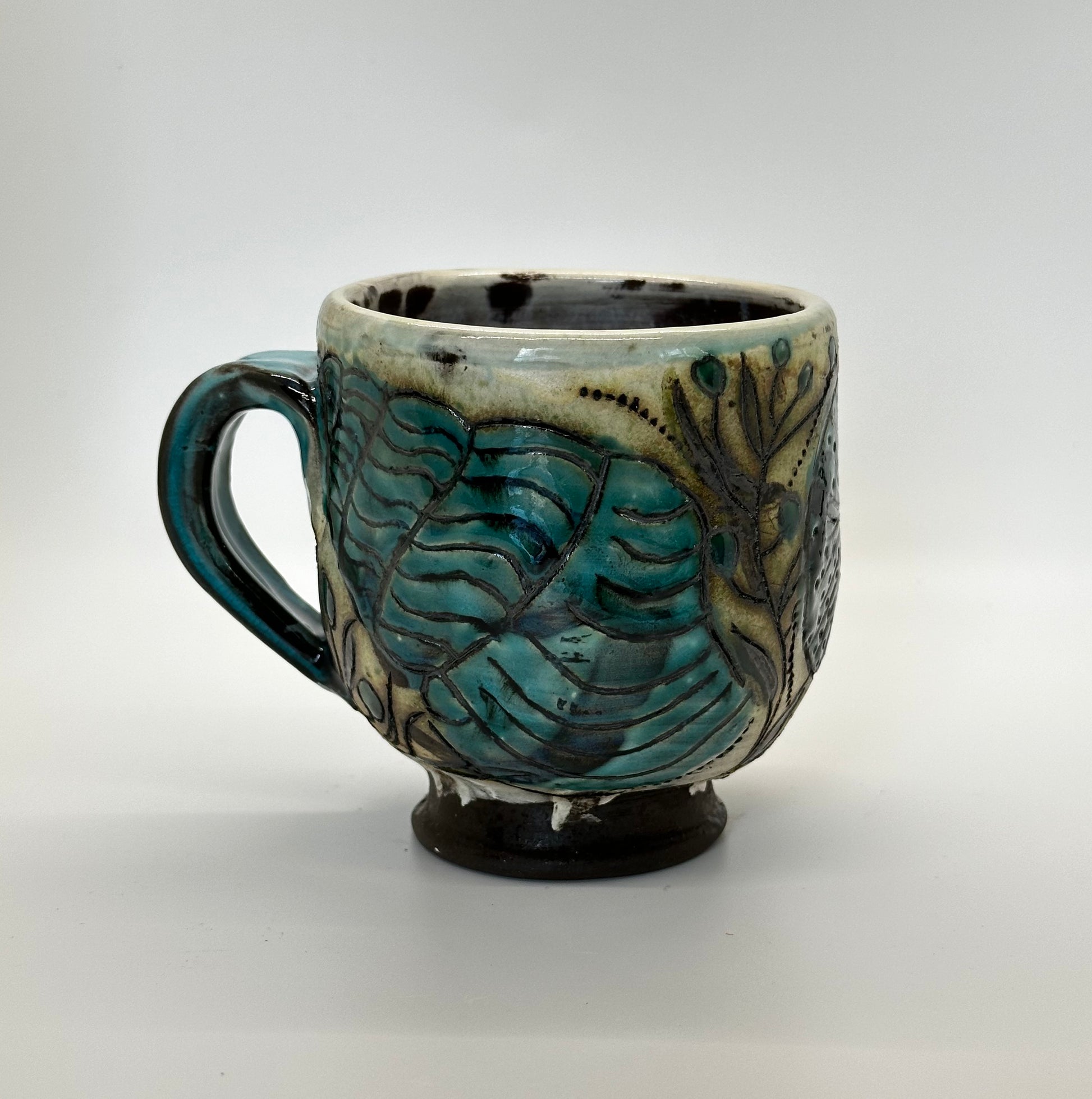 Black stoneware clay with porcelain slip incisions that are filled with oxides and fired to appx 2000+- degrees. All are finished with hand-applied transparent glazes. All black clay mugs are 3.5" to 4" tall and 3.25" to 3.5" in diameter. Each mug holds at least 8oz+- of liquid. Each mug is unique and one of a kind complete with slightly quirky marks and indentions, including those from my fingers, adding warmth and texture that define the character and individuality of each piece. Microwave and dishwasher safe.