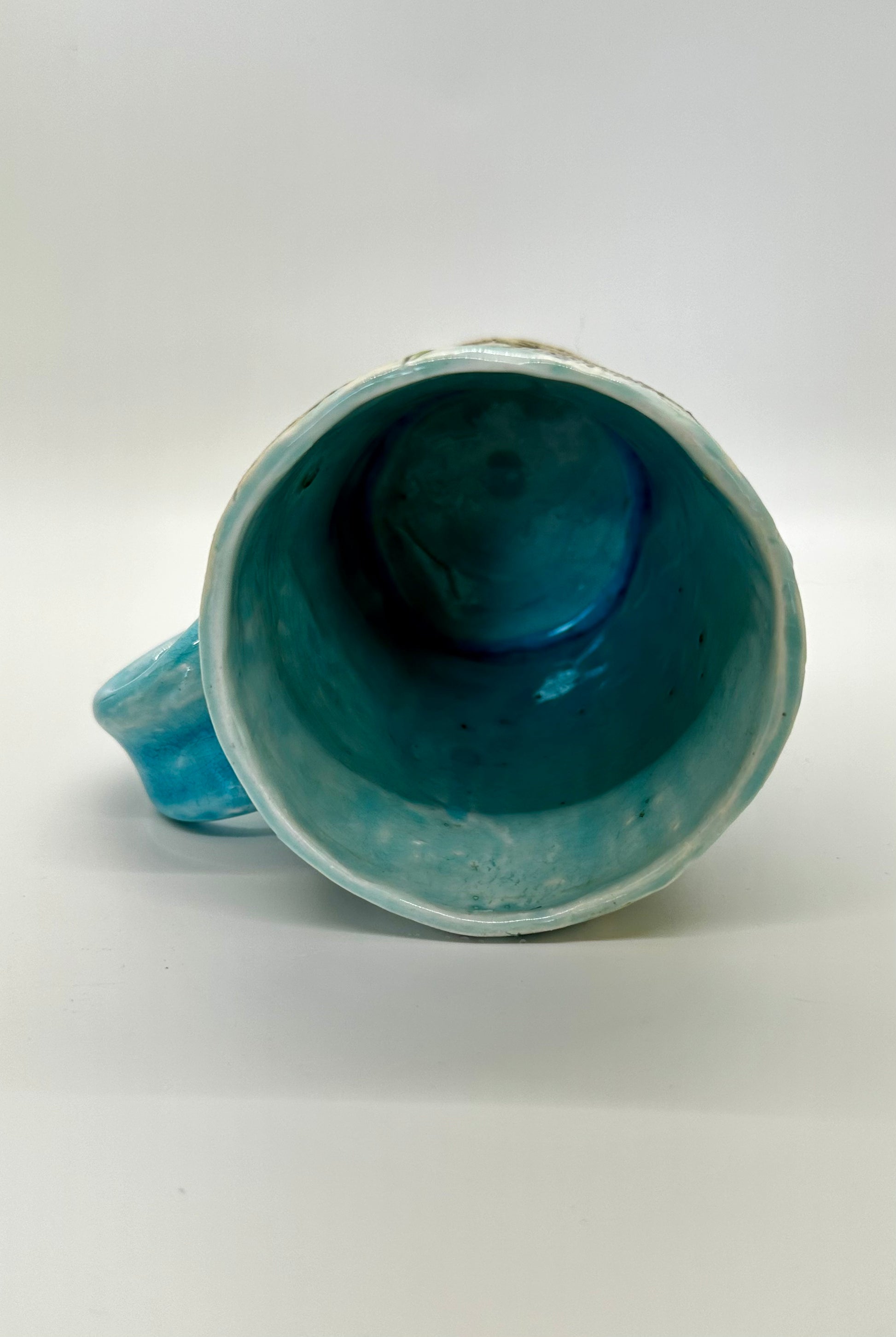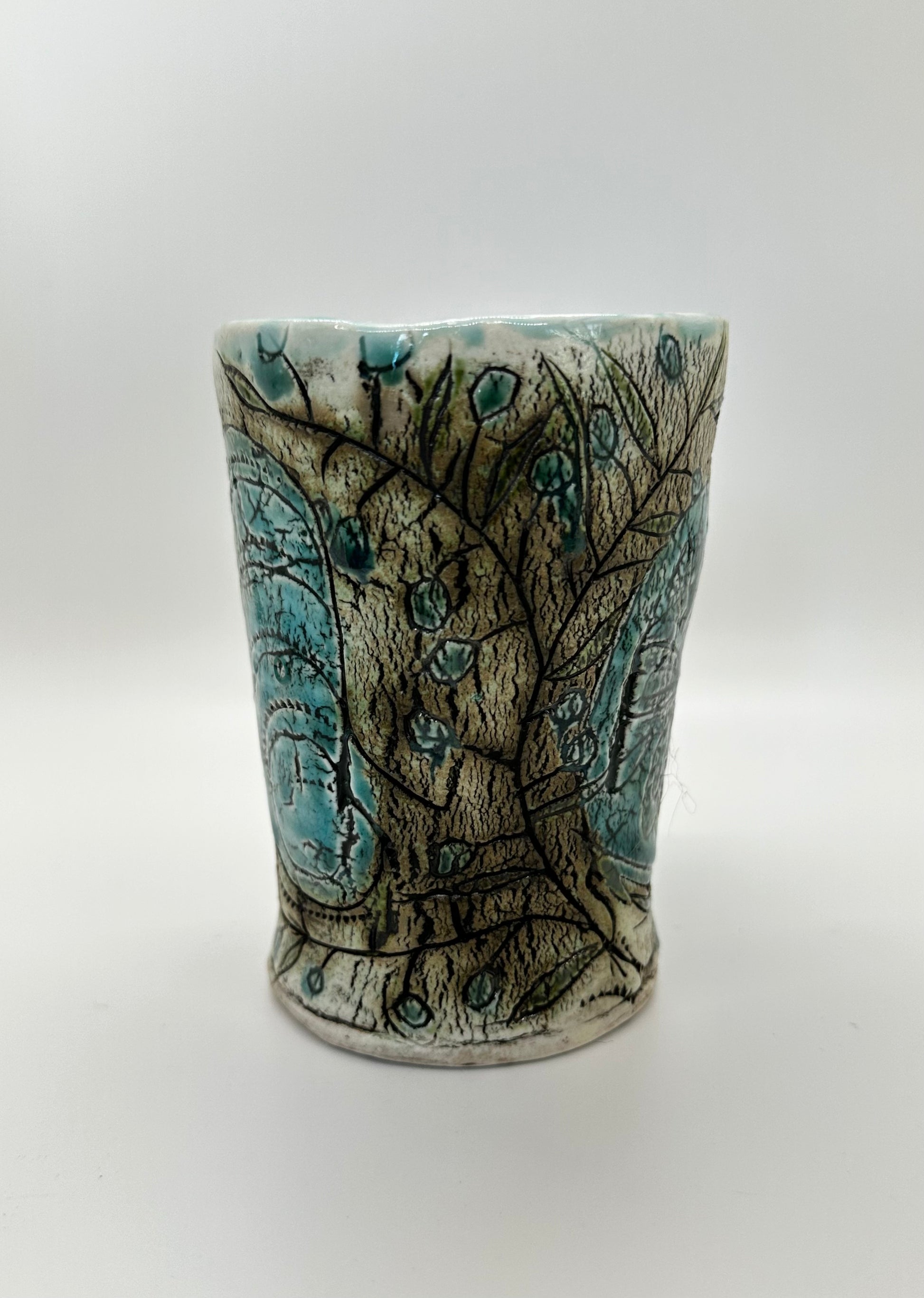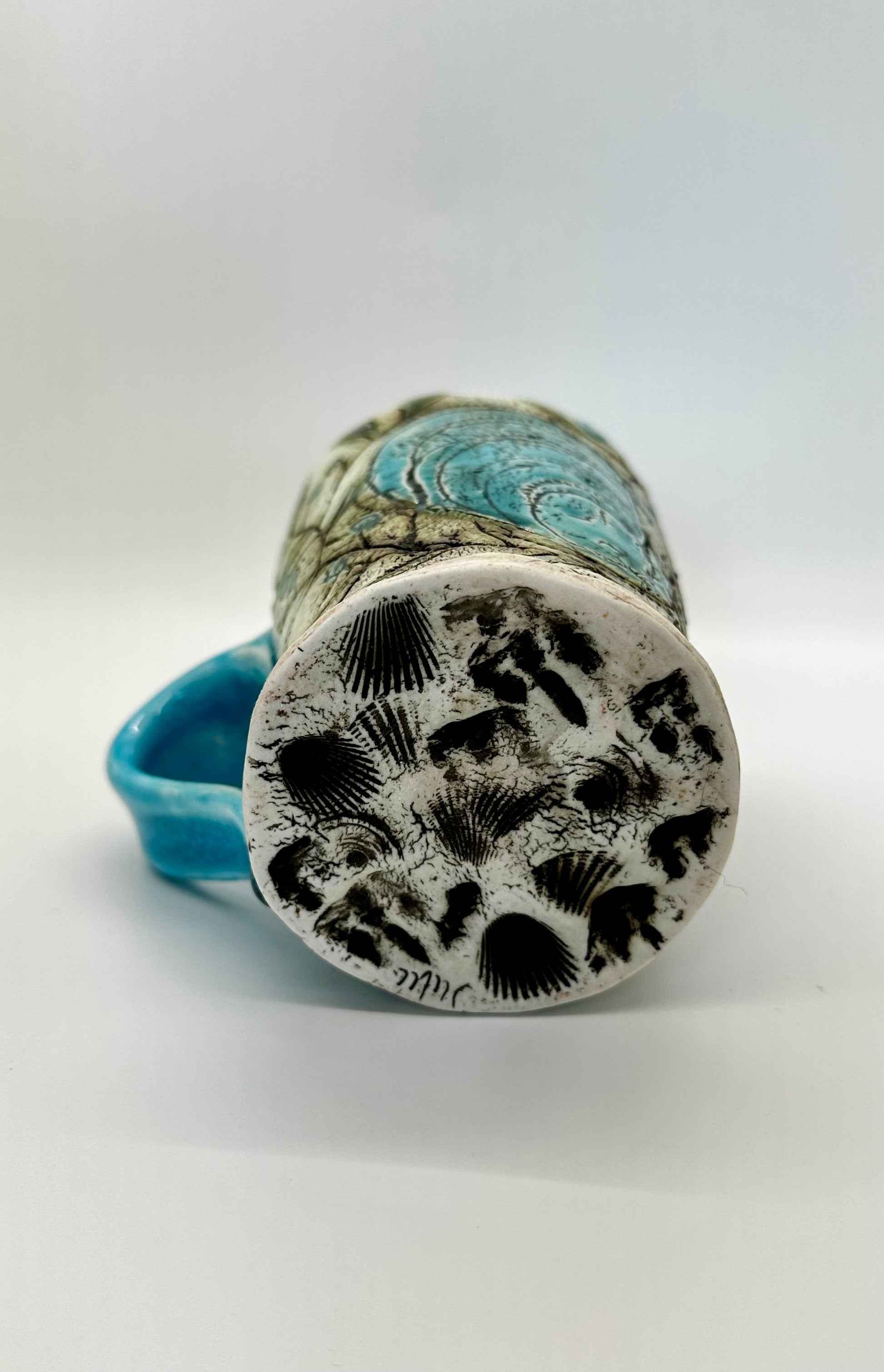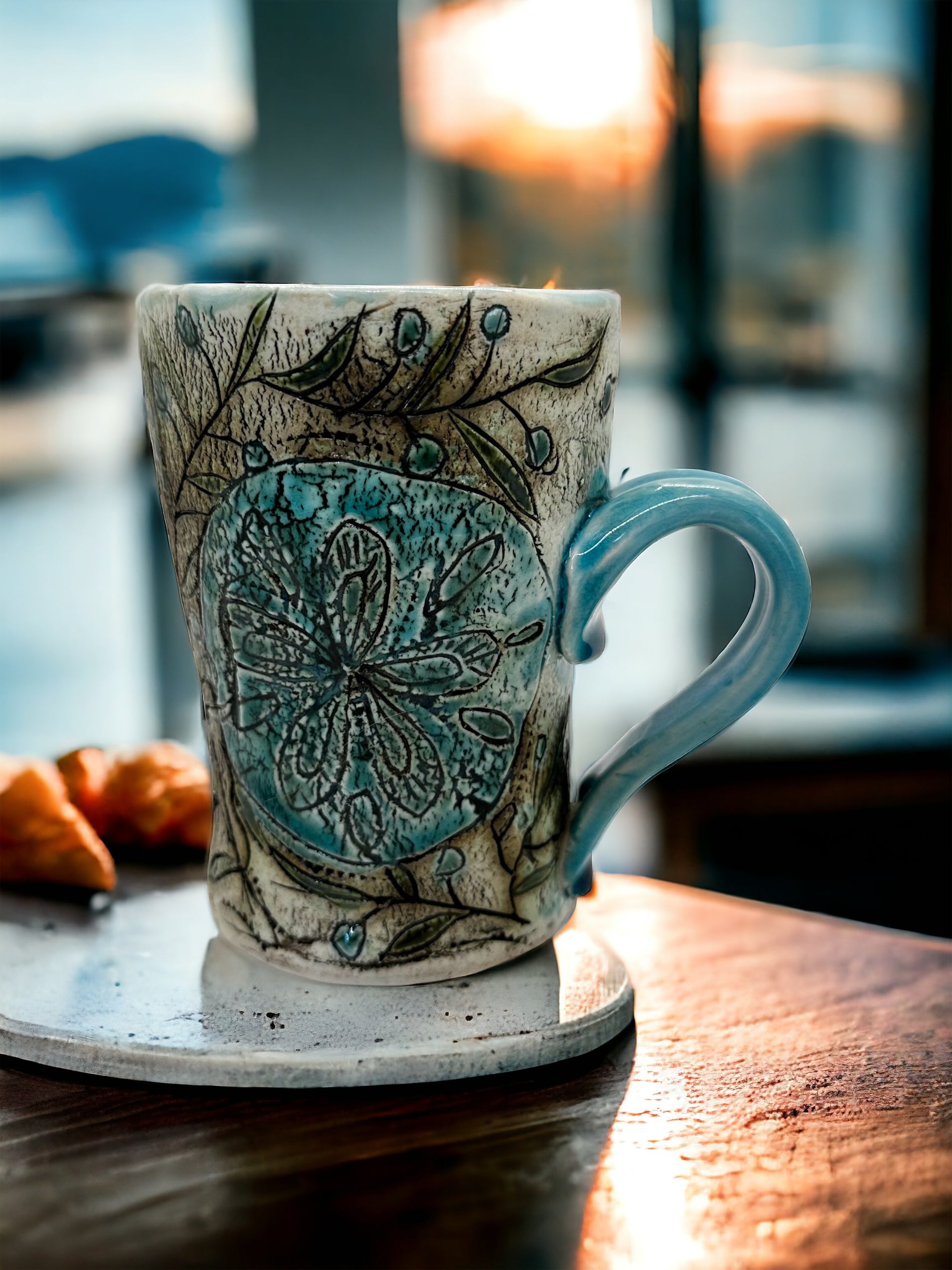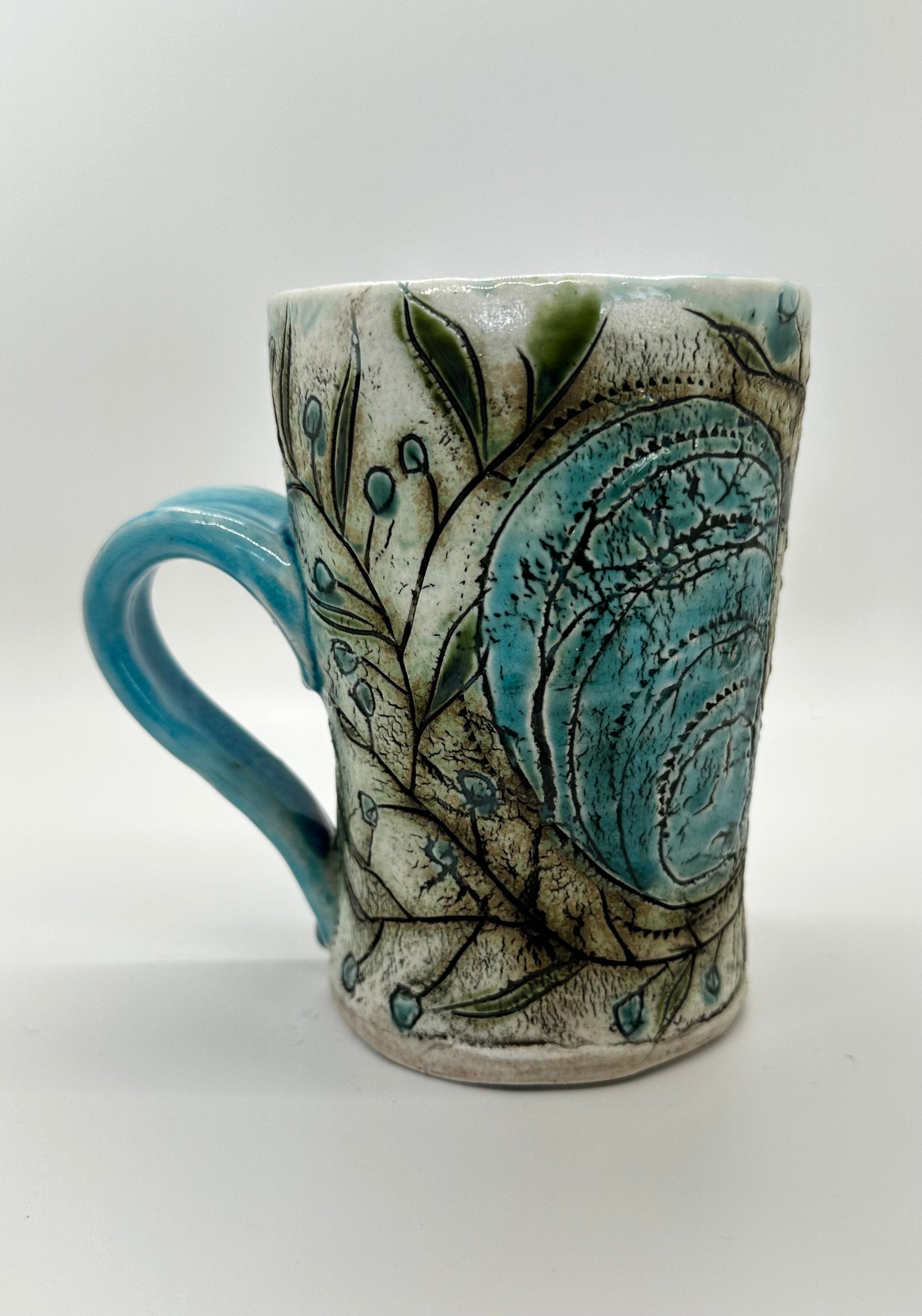 Hand-formed mug incised, filled with oxides and fired to appx 2000+- degrees. Finished with hand-applied transparent glazes. The delicate texture shines through the oxide application. This mug is appx 4.5" tall and 3" in diameter. It holds 10oz+- of liquid. Each mug is unique and one of a kind complete with slightly quirky marks and indentions, including those from my fingers, adding warmth and texture that define the character and individuality of each piece. Microwave and dishwasher safe.
