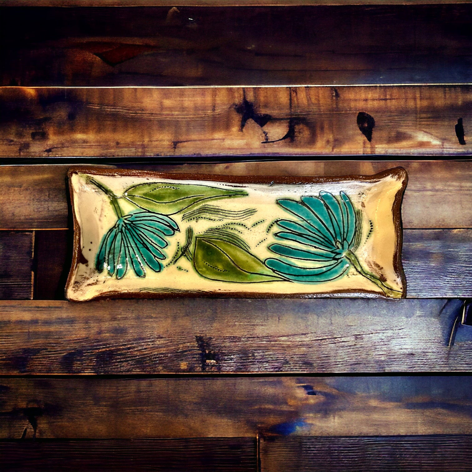 3.5-4 x 10ish small stoneware serving tray. Slip, incised, glazed.