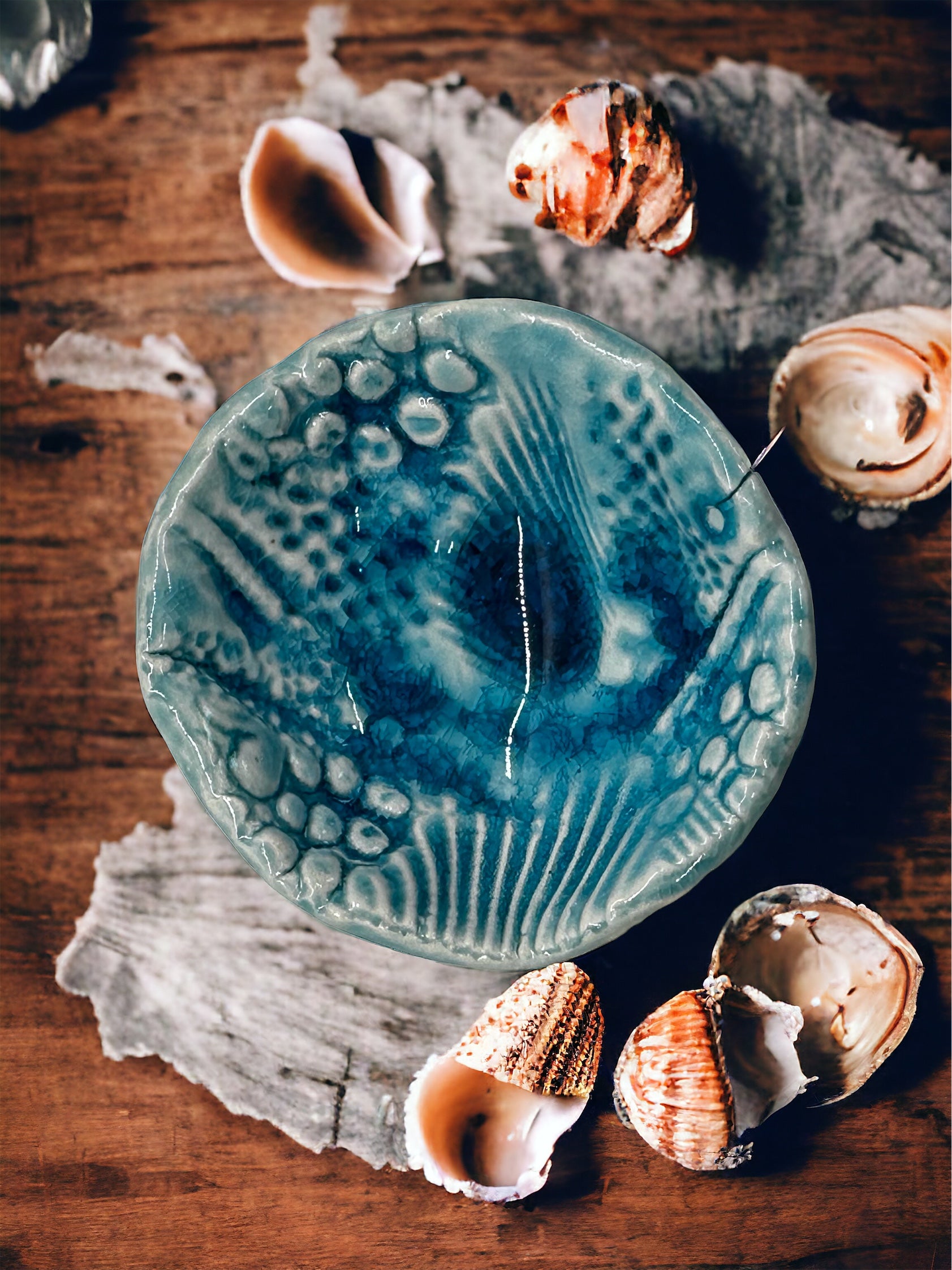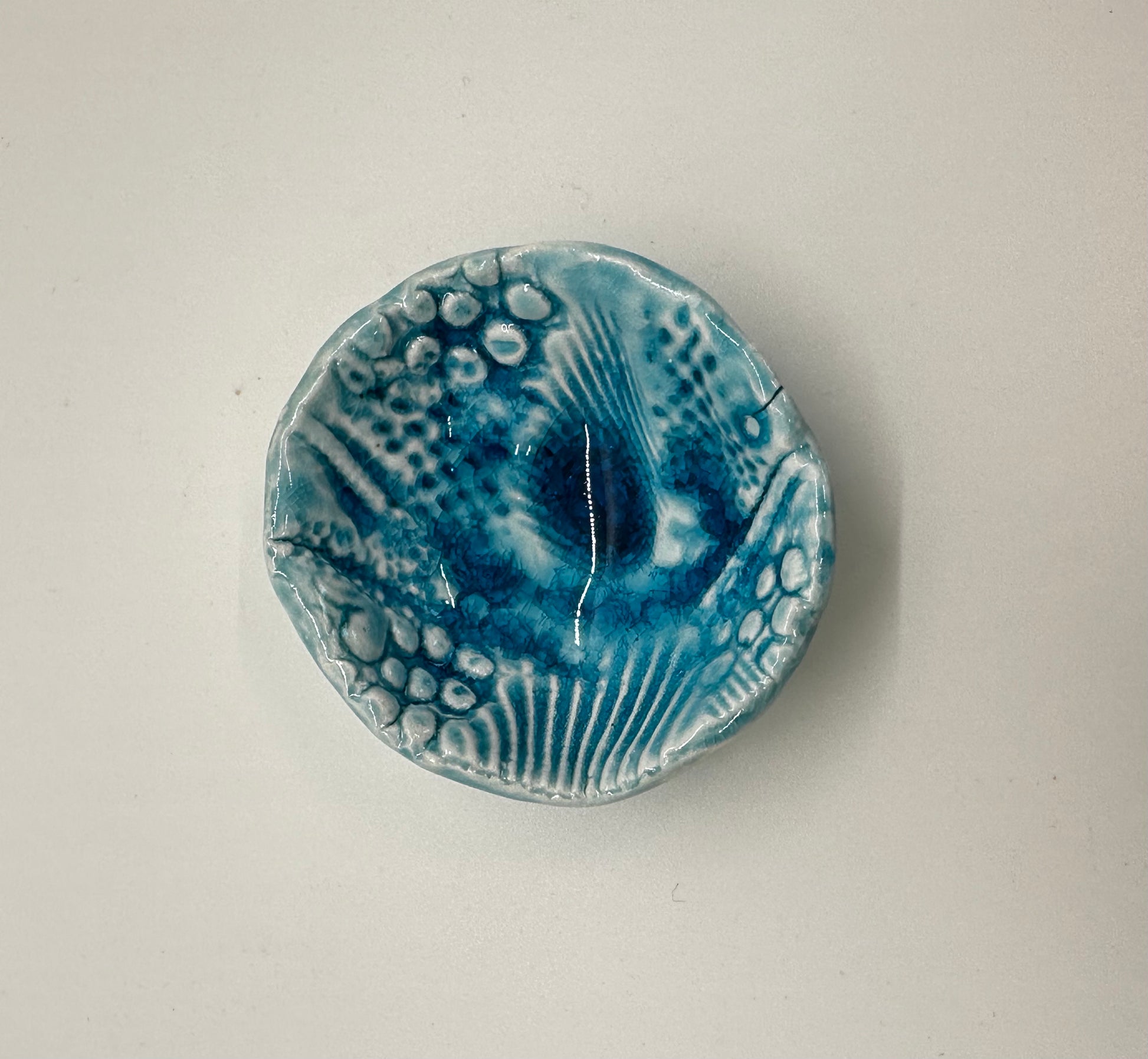 This tiny treasure is textured using actual seashells, coral, starfish, etc. Made of porcelain and glazed with a dreamy, rich water blue that pools in the indentions. 2.5" in diameter, they are perfect for little accents that make a big impact. Can be used for trinkets or just pretty objects of art! I can custom make tiny treasures like these using personal items such as crosses, jewelry, etc for a one-of-a-kind gift or favors for showers, weddings, etc.