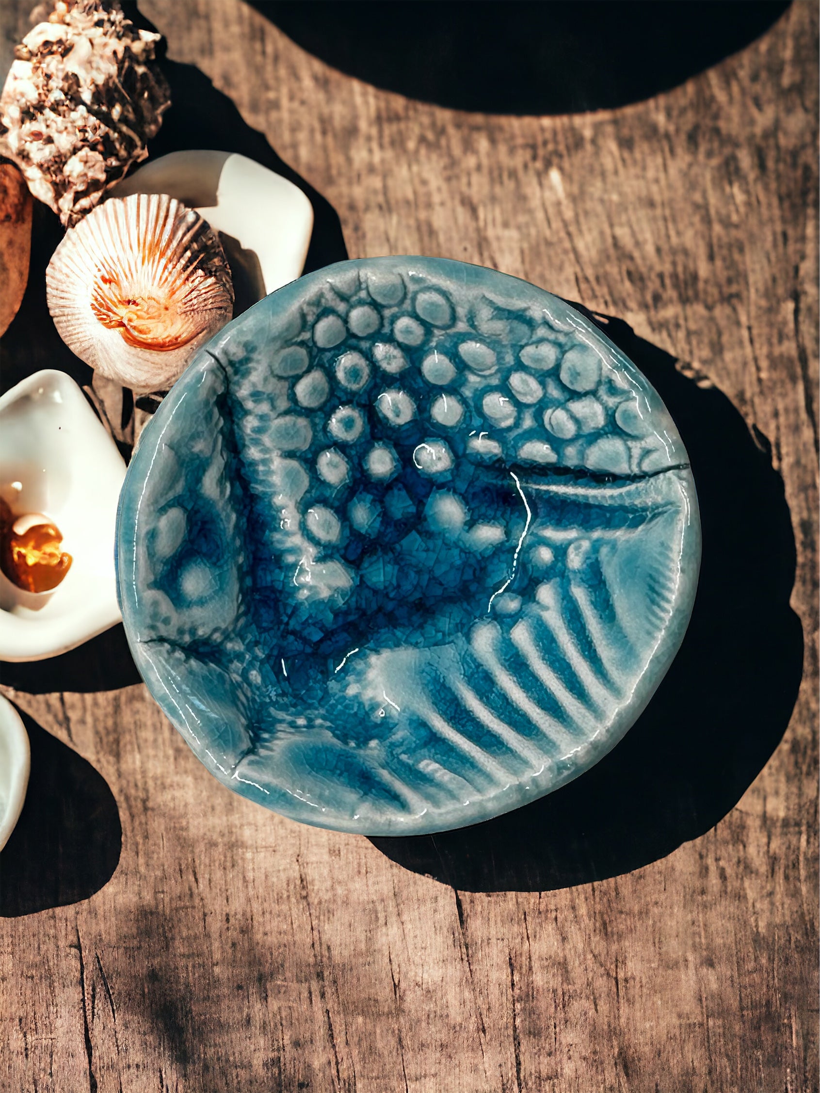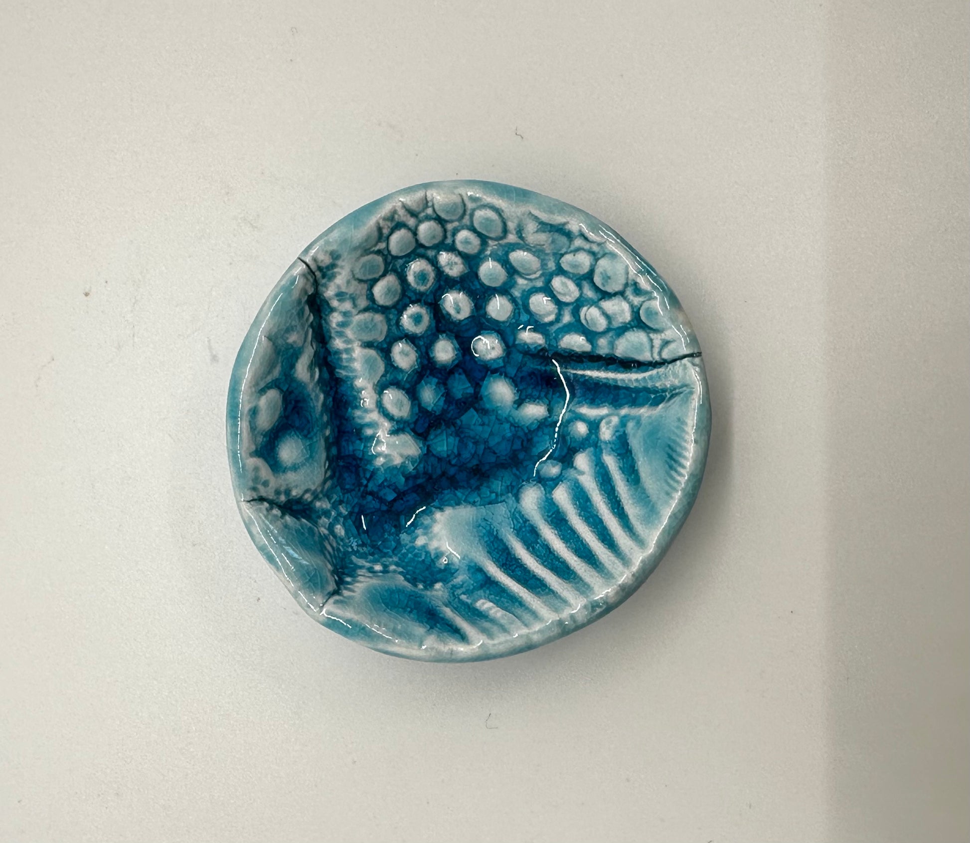 This tiny treasure is textured using actual seashells, coral, starfish, etc. Made of porcelain and glazed with a dreamy, rich water blue that pools in the indentions. 2.5" in diameter, they are perfect for little accents that make a big impact. Can be used for trinkets or just pretty objects of art! I can custom make tiny treasures like these using personal items such as crosses, jewelry, etc for a one-of-a-kind gift or favors for showers, weddings, etc.